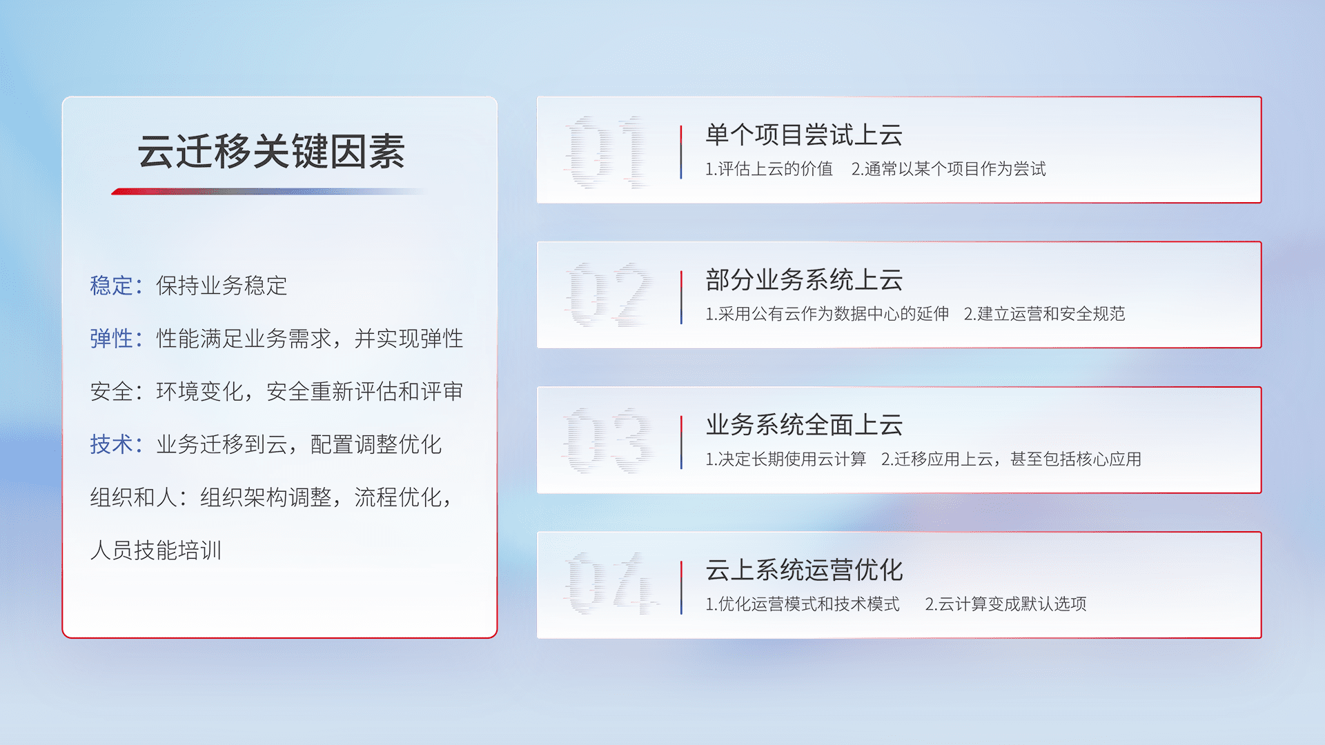 结合实际业务,,,,从规划设计、、、云平台选型、、、、云原生改造、、、、数据迁移、、、集成交付,,,,迁移全过程为客户识别最佳上云路径,,,做好风险识别管理,,,设计网络架构、、、身份权限、、安全审计合规、、操作审计、、、日志审计、、监控告警策略、、、多站点容灾设计等,,,对云上基础设施进行整体规划,,,提升IT治理水平,,,,以满足弹性、、高可用、、高性能的需求。。