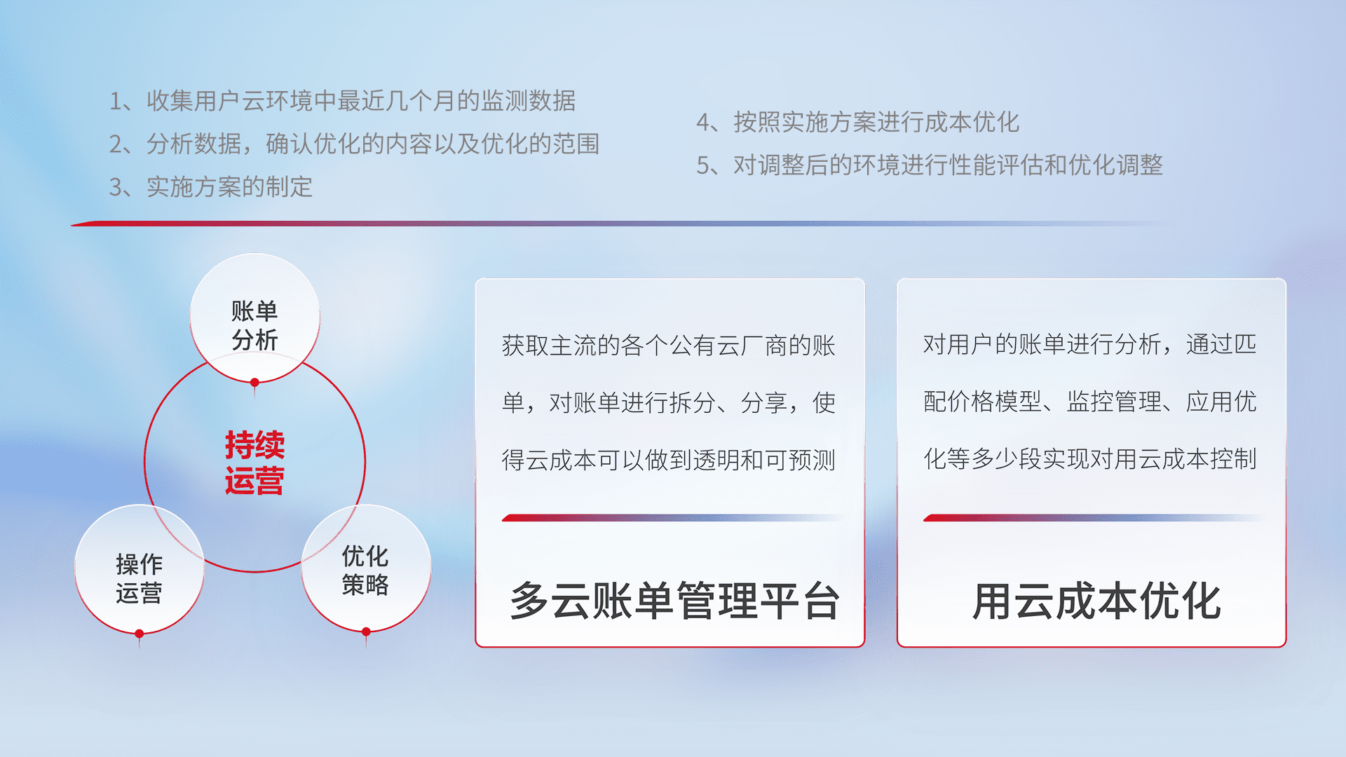 通过多云纳管,,以统一的资源数据模型把客户的云资源进行抽象和封装,,,进而实现对多云资源的统一操作,,保障云资源管理的可靠性、、稳定性与可用性。。。。量身定制化运维内容,,,,配置、、开发运维、、、、补丁管理、、、备份、、、监控、、、认证和访问管理、、、审计和日常巡检等,,,保障在用云过程中的可靠度,,,稳定度以及高可用率。。